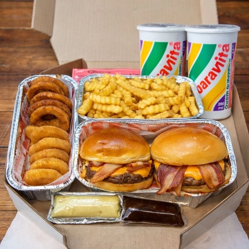 2 hambúrgueres + batata cheddar e bacon + 2 Guaravita pra matar a fome de verdade.