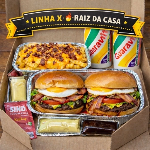 CAIXA linha X com 2 hambúrgueres + batata p/ 2 + 2 Guaravita + 2 molhos G